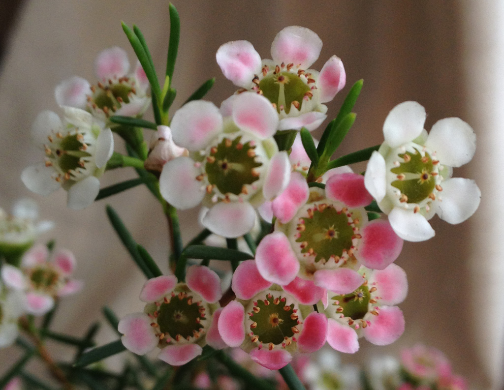 ワックスフラワーの名前の由来は、その花弁がワックスをかけたように固いから。実際にさわってみるとまさに「ろう」で固めたようにかたい。乾燥したオーストラリアの大地に適応した作りだ。